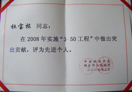 程”先 進(jìn)集體榮譽(yù)稱號(hào),董事長(zhǎng)杜寶棟被評(píng)為實(shí)施“3.50工程”先進(jìn)個(gè)人。